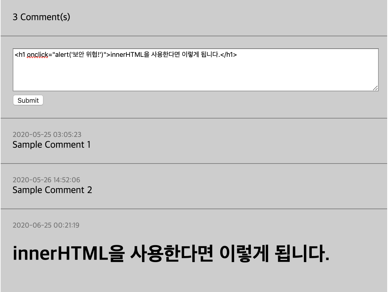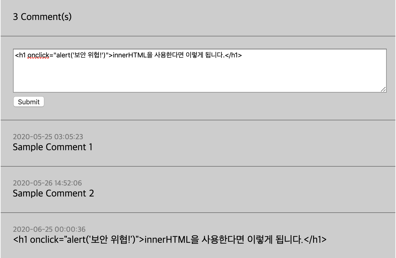 innerHTML은 HTML구조를 모두 긁어온다는 것에 그 문제가 있습니다. 인풋 태그에 html태그를 작성하고 onclick과 같은 자바스크립트 함수를 넣게 되면 실행된다는 문제가 발생합니다. 이와 관련된 문제를 XSS 공격이라고 합니다.